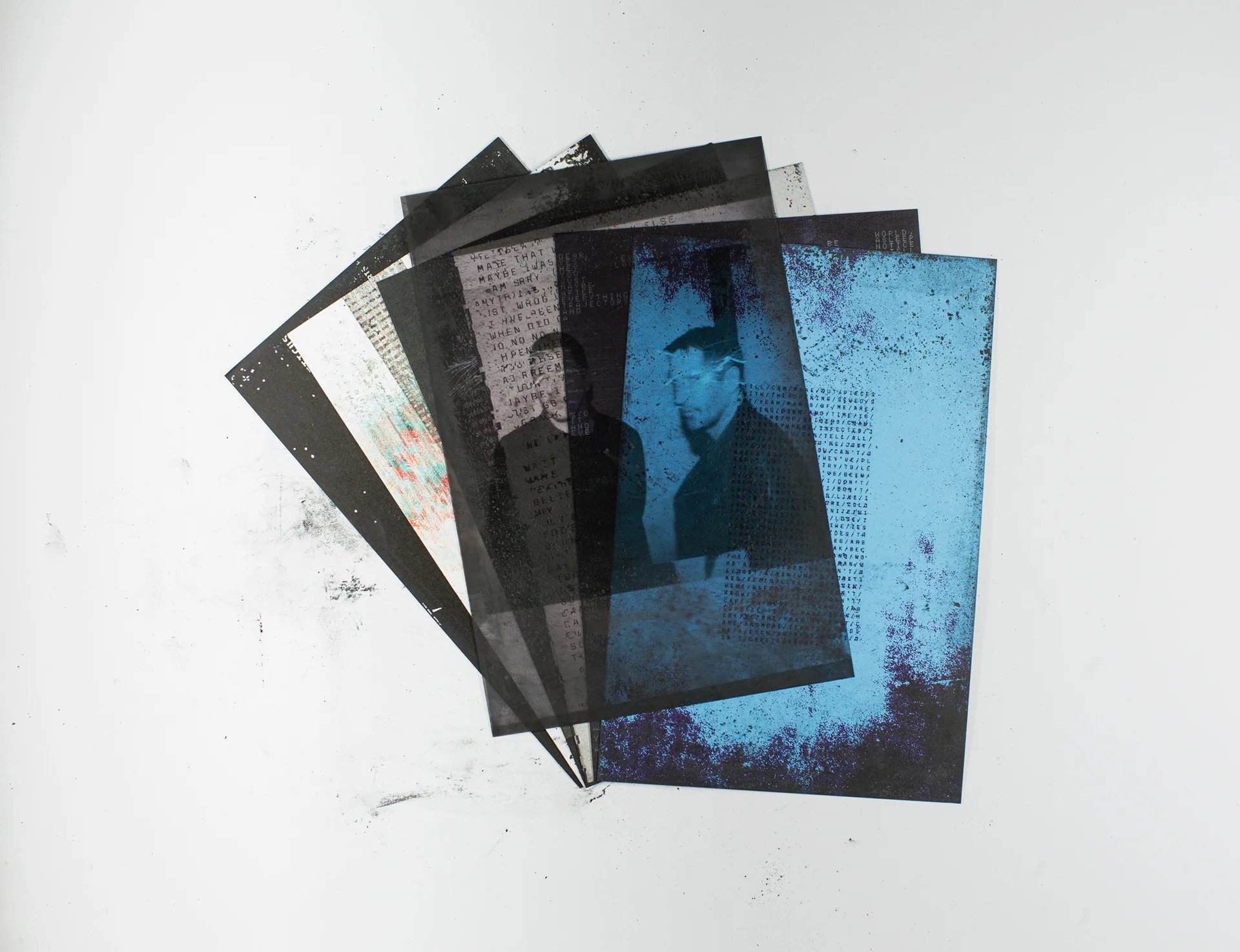 Each cover is given a variable amount of black powder that intermingles with the artwork, blurring what is printed and what is smudged. It also allows for each recipient to have a unique piece of art.